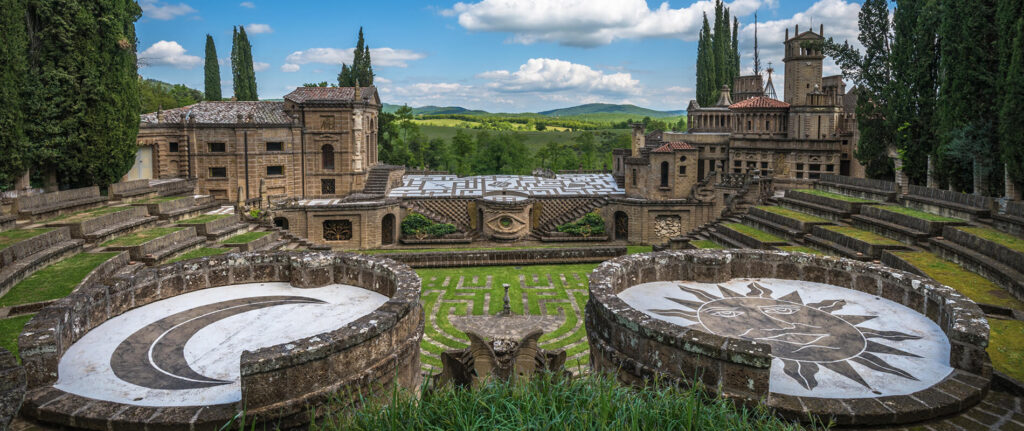 La Scarzuola è un luogo da percorrere, non da spiegare: scale che salgono e scendono in ogni direzione, edifici volutamente sproporzionati, mostri, simboli astrologici, geometrie sacre, riferimenti mitologici e alchemici accompagnano il visitatore in un labirinto evocativo, ispirato all’Hypnerotomachia Poliphili (1499), il grande romanzo rinascimentale sul viaggio dell’anima verso la conoscenza e l’amore.