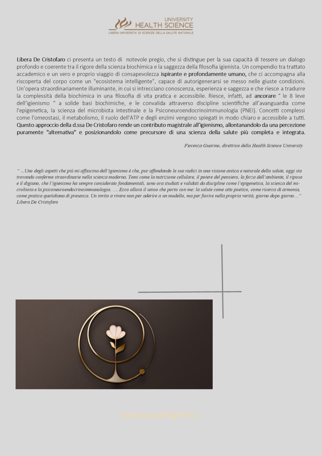 Libera Cristofaro ha realizzato, alla fine del suo percorso di studi del primo anno con la HSU, una tesi che con grande maestria spiega in maniera chiara e semplice, nonostante l’argomento non lo sia, quanto le fondamenta dell’Igiene Naturale trovino conferme nelle varie scienze mediche come la Biochimica.